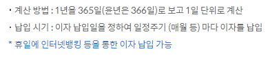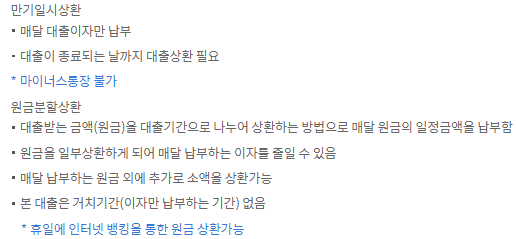 담보는 신청자의 신용을 보며, 대출 기간은 상환방법에 따라 아래와 같이 달라집니다.